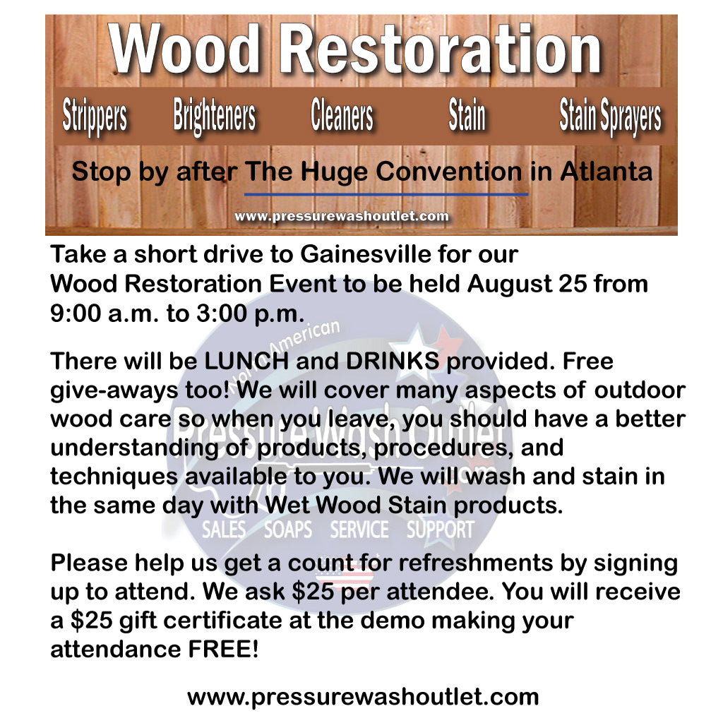 Call 678 207- 3487 to reserve your place for the Outdoor Wood Care Demo, sponsored by North American Pressure Wash Outlet.