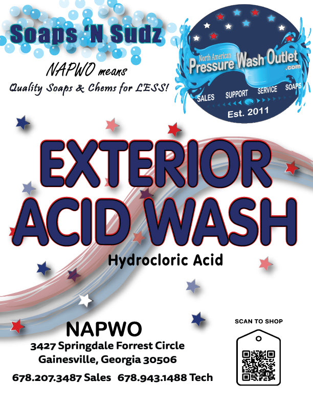 {"id":4284390529,"title":"EXTERIOR ACID WASH","handle":"exterior-acid-cleaner-5-gallon","description":"\u003cp\u003e\u003cspan\u003eLike NB80? Many stains require the use of an acid-based product. Exterior Acid Wash has been used for over a decade in the pressure wash and cleaning restoration industry.\u003c\/span\u003e\u003c\/p\u003e\n\u003cp\u003e\u003cspan\u003eThis product is excellent for mineral stains, rust stains, irrigation stains, fertilizer stains and Georgia red clay stains. This contains \u003cb\u003e\u003cu\u003ehydrochloric acid\u003c\/u\u003e\u003c\/b\u003e. It can be used in hand pump or pressure washers.\u003c\/span\u003e\u003c\/p\u003e\n\u003cp\u003e\u003cspan\u003eTypical dilution 4:1 though uses may vary. It is a builder restoration cleaner when used as directed. \u003c\/span\u003e\u003c\/p\u003e\n\u003cp\u003e\u003cstrong\u003e\u003cspan style=\"text-decoration: underline;\"\u003eApplication Methods:\u003c\/span\u003e\u003c\/strong\u003e\u003c\/p\u003e\n\u003cp\u003e\u003cspan\u003eThis product can be X-Jetted using the appropriate proportioner for your machine GPM and a proportioner that will achieve a 4:1 dilution.\u003c\/span\u003e\u003c\/p\u003e\n\u003cp\u003e\u003cspan\u003eThis product can be used with your downstream injector rated at a 20% draw.\u003c\/span\u003e\u003c\/p\u003e\n\u003cp\u003e\u003cspan\u003eSee \u003ca href=\"https:\/\/www.pressurewashoutlet.com\/pages\/free-shipping-policy\"\u003e\u003cspan style=\"color: #2b00ff;\"\u003eFREE FREIGHT POLICY\u003c\/span\u003e\u003c\/a\u003e for drum orders.\u003c\/span\u003e\u003c\/p\u003e\n\u003cp\u003e\u003ca href=\"https:\/\/cdn.shopify.com\/s\/files\/1\/1183\/1612\/files\/Exterior_Acid_Wash_16330_1.pdf?1559434639378202835\" title=\"SDS Exterior Acid Wash\"\u003e\u003cspan\u003e\u003cimg src=\"\/\/cdn.shopify.com\/s\/files\/1\/1183\/1612\/files\/246x0w_large.png?v=1526957604\" alt=\"\"\u003e\u003c\/span\u003e\u003c\/a\u003e\u003c\/p\u003e","published_at":"2016-02-24T10:54:00-05:00","created_at":"2016-02-24T10:54:20-05:00","vendor":"Soaps 'N Sudz","type":"Soaps and Chemicals","tags":["acid cleaner","georgia power wash store","georgia pressure wash store","hydrochloric acid","industrial pressure washer","industrial pressure washers","irrigation stains","mud stain remover","north american pressure wash outlet","parts for pressure washers","power pressure wash supplies","power wash equipment","pressure wash chemicals","pressure wash equipment","pressure wash parts delivered","pressure wash pumps","pressure wash supply","pressure wash supply near me","pressure wash supply store","pressurewashpartsdelivered","rust remover","rust remover plus","soaps 'n sudz"],"price":2199,"price_min":2199,"price_max":67500,"available":true,"price_varies":true,"compare_at_price":null,"compare_at_price_min":0,"compare_at_price_max":0,"compare_at_price_varies":false,"variants":[{"id":12786283970583,"title":"1 Gallon (8102.5)","option1":"1 Gallon (8102.5)","option2":null,"option3":null,"sku":"8102.5","requires_shipping":true,"taxable":true,"featured_image":{"id":40350348706078,"product_id":4284390529,"position":1,"created_at":"2023-01-13T15:18:08-05:00","updated_at":"2024-11-12T12:52:25-05:00","alt":"Exterior Acid Wash for rust removal at North American Pressure Wash Outlet","width":612,"height":792,"src":"\/\/www.pressurewashoutlet.com\/cdn\/shop\/products\/exterior-acid-wash.jpg?v=1731433945","variant_ids":[12273989953,39875185741,12786283970583]},"available":true,"name":"EXTERIOR ACID WASH - 1 Gallon (8102.5)","public_title":"1 Gallon (8102.5)","options":["1 Gallon (8102.5)"],"price":2199,"weight":3629,"compare_at_price":null,"inventory_quantity":-108,"inventory_management":"shopify","inventory_policy":"continue","barcode":null,"featured_media":{"alt":"Exterior Acid Wash for rust removal at North American Pressure Wash Outlet","id":32685629767966,"position":1,"preview_image":{"aspect_ratio":0.773,"height":792,"width":612,"src":"\/\/www.pressurewashoutlet.com\/cdn\/shop\/products\/exterior-acid-wash.jpg?v=1731433945"}},"requires_selling_plan":false,"selling_plan_allocations":[]},{"id":12273989953,"title":"5 Gallon (8103)","option1":"5 Gallon (8103)","option2":null,"option3":null,"sku":"8103","requires_shipping":true,"taxable":true,"featured_image":{"id":40350348706078,"product_id":4284390529,"position":1,"created_at":"2023-01-13T15:18:08-05:00","updated_at":"2024-11-12T12:52:25-05:00","alt":"Exterior Acid Wash for rust removal at North American Pressure Wash Outlet","width":612,"height":792,"src":"\/\/www.pressurewashoutlet.com\/cdn\/shop\/products\/exterior-acid-wash.jpg?v=1731433945","variant_ids":[12273989953,39875185741,12786283970583]},"available":true,"name":"EXTERIOR ACID WASH - 5 Gallon (8103)","public_title":"5 Gallon (8103)","options":["5 Gallon (8103)"],"price":9950,"weight":22680,"compare_at_price":null,"inventory_quantity":-53,"inventory_management":"shopify","inventory_policy":"continue","barcode":null,"featured_media":{"alt":"Exterior Acid Wash for rust removal at North American Pressure Wash Outlet","id":32685629767966,"position":1,"preview_image":{"aspect_ratio":0.773,"height":792,"width":612,"src":"\/\/www.pressurewashoutlet.com\/cdn\/shop\/products\/exterior-acid-wash.jpg?v=1731433945"}},"requires_selling_plan":false,"selling_plan_allocations":[]},{"id":39875185741,"title":"55 Gallon Drum (8104)","option1":"55 Gallon Drum (8104)","option2":null,"option3":null,"sku":"8104","requires_shipping":true,"taxable":true,"featured_image":{"id":40350348706078,"product_id":4284390529,"position":1,"created_at":"2023-01-13T15:18:08-05:00","updated_at":"2024-11-12T12:52:25-05:00","alt":"Exterior Acid Wash for rust removal at North American Pressure Wash Outlet","width":612,"height":792,"src":"\/\/www.pressurewashoutlet.com\/cdn\/shop\/products\/exterior-acid-wash.jpg?v=1731433945","variant_ids":[12273989953,39875185741,12786283970583]},"available":true,"name":"EXTERIOR ACID WASH - 55 Gallon Drum (8104)","public_title":"55 Gal