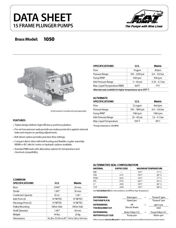 {"id":4284292481,"title":"1050 15 FR by CAT PUMPS (5715)","handle":"1050-15pfr-pump-10gpm-2200psi-958rpm","description":"\u003cp\u003eThis CAT 1050 pump is rated:\u003c\/p\u003e\n\u003cul\u003e\n\u003cli\u003e10 GPM\u003c\/li\u003e\n\u003cli\u003e2200 PSI\u003c\/li\u003e\n\u003cli\u003e958 RPM\u003c\/li\u003e\n\u003cli\u003e30mm Shaft\u003c\/li\u003e\n\u003cli\u003e44 lbs.\u003c\/li\u003e\n\u003c\/ul\u003e\n\u003cp\u003e\u003cspan\u003eThis triplex (three plunger rods) positive displacement, reciprocating plunger pump is constructed with a chrome-plated brass manifold, 304 stainless steel valve assemblies, solid ceramic plungers and standard NBR (Buna-N) seals and O-rings.\u003c\/span\u003e\u003c\/p\u003e\n\u003cp\u003e\u003cspan style=\"color: rgb(19, 48, 121);\"\u003e\u003cstrong\u003e\u003ca href=\"https:\/\/cdn.shopify.com\/s\/files\/1\/1183\/1612\/files\/1050-SERVICE-MANUAL.pdf?v=1718800459\" style=\"color: rgb(19, 48, 121);\"\u003ePump Service Manual\u003c\/a\u003e\u003c\/strong\u003e\u003c\/span\u003e\u003c\/p\u003e\n\u003cp\u003e \u003c\/p\u003e\n\u003cp\u003e \u003c\/p\u003e\n\u003ciframe width=\"260\" height='155\"' src=\"https:\/\/www.youtube.com\/embed\/8p8aQDaBCrQ?si=PFo1quckzmAKIgYR\" title=\"YouTube video player\" frameborder=\"0\" allow=\"accelerometer; autoplay; clipboard-write; encrypted-media; gyroscope; picture-in-picture; web-share\" referrerpolicy=\"strict-origin-when-cross-origin\" allowfullscreen\u003e\u003c\/iframe\u003e","published_at":"2016-02-24T10:51:59-05:00","created_at":"2016-02-24T10:51:59-05:00","vendor":"CAT Pumps","type":"Pumps","tags":["10 GPM","2200 PSI","CAT PUMP 1050","georgia power wash store","georgia pressure wash store","industrial pressure wash pumps","industrial pressure washer","industrial pressure washers","north american pressure wash outlet","parts for pressure washers","power pressure wash supplies","power wash equipment","pressure wash equipment","pressure wash parts delivered","pressure wash pump","pressure wash pumps","pressure wash supply","pressure wash supply near me","pressure wash supply store"],"price":315075,"price_min":315075,"price_max":315075,"available":true,"price_varies":false,"compare_at_price":null,"compare_at_price_min":0,"compare_at_price_max":0,"compare_at_price_varies":false,"variants":[{"id":12273868225,"title":"Default Title","option1":"Default Title","option2":null,"option3":null,"sku":"5715","requires_shipping":true,"taxable":true,"featured_image":null,"available":true,"name":"1050 15 FR by CAT PUMPS (5715)","public_title":null,"options":["Default Title"],"price":315075,"weight":19958,"compare_at_price":null,"inventory_quantity":1,"inventory_management":null,"inventory_policy":"deny","barcode":null,"requires_selling_plan":false,"selling_plan_allocations":[]}],"images":["\/\/www.pressurewashoutlet.com\/cdn\/shop\/products\/1050_1.jpg?v=1505164245","\/\/www.pressurewashoutlet.com\/cdn\/shop\/files\/1050_L_c8c28460-13cf-4d4c-bdb0-eeec97f02c14.jpg?v=1720729948","\/\/www.pressurewashoutlet.com\/cdn\/shop\/files\/1050_2_6014bbb8-ca92-4fa6-b1fd-c215aa5e0b43.jpg?v=1720729948","\/\/www.pressurewashoutlet.com\/cdn\/shop\/files\/CAT-PUMP-RETAILER_8699b310-16be-4bd1-a81f-d7a2bbcfd65e.jpg?v=1720729948","\/\/www.pressurewashoutlet.com\/cdn\/shop\/files\/thank-you_6896a9ce-1f51-4443-a5c4-fe27b4a97f65.jpg?v=1720729948"],"featured_image":"\/\/www.pressurewashoutlet.com\/cdn\/shop\/products\/1050_1.jpg?v=1505164245","options":["Title"],"media":[{"alt":"CAT PUMP 1050 15 FR available at North American Pressure Wash Outlet","id":55900176407,"position":1,"preview_image":{"aspect_ratio":1.329,"height":216,"width":287,"src":"\/\/www.pressurewashoutlet.com\/cdn\/shop\/products\/1050_1.jpg?v=1505164245"},"aspect_ratio":1.329,"height":216,"media_type":"image","src":"\/\/www.pressurewashoutlet.com\/cdn\/shop\/products\/1050_1.jpg?v=1505164245","width":287},{"alt":null,"id":39356513190174,"position":2,"preview_image":{"aspect_ratio":0.773,"height":792,"width":612,"src":"\/\/www.pressurewashoutlet.com\/cdn\/shop\/files\/1050_L_c8c28460-13cf-4d4c-bdb0-eeec97f02c14.jpg?v=1720729948"},"aspect_ratio":0.773,"height":792,"media_type":"image","src":"\/\/www.pressurewashoutlet.com\/cdn\/shop\/files\/1050_L_c8c28460-13cf-4d4c-bdb0-eeec97f02c14.jpg?v=1720729948","width":612},{"alt":null,"id":39356513222942,"position":3,"preview_image":{"aspect_ratio":0.773,"height":792,"width":612,"src":"\/\/www.pressurewashoutlet.com\/cdn\/shop\/files\/1050_2_6014bbb8-ca92-4fa6-b1fd-c215aa5e0b43.jpg?v=1720729948"},"aspect_ratio":0.773,"height":792,"media_type":"image","src":"\/\/www.pressurewashoutlet.com\/cdn\/shop\/files\/1050_2_6014bbb8-ca92-4fa6-b1fd-c215aa5e0b43.jpg?v=1720729948","width":612},{"alt":"CAT Pumps available at North American Pressure Wash Outlet","id":39356513124638,"position":4,"preview_image":{"aspect_ratio":1.0,"height":432,"width":432,"src":"\/\/www.pressurewashoutlet.com\/cdn\/shop\/files\/CAT-PUMP-RETAILER_8699b310-16be-4bd1-a81f-d7a2bbcfd65e.jpg?v=1720729948"},"aspect_ratio":1.0,"height":432,"media_type":"image","src":"\/\/www.pressurewashoutlet.com\/cdn\/shop\/files\/CAT-PUMP-RETAILER_8699b310-16be-4bd1-a81f-d7a2bbcfd65e.jpg?v=1720729948","width":432},{"alt":"Industrial Pressure Washers available at North American Pressure Wash Outlet","id":39356513157406,"position":5,"preview_image":{"aspect_ratio":1.0,"height":288,"width":288,"src":"\/\/www.pressurewashoutlet.com\/cdn\/shop\/files\/thank-you_6896a9ce-1f51-4443-a5c4-fe27b4a97f65.jpg?v=1720729948"},"aspect_ratio":1.0,"height":288,"media_type":"image","src":"\/\/www.pressurewashoutlet.com\/cdn\/shop\/files\/thank-you_6896a9ce-1f51-4443-a5c4-fe27b4a97f65.jpg?v=1720729948","width":288}],"requires_selling_plan":false,"selling_plan_groups":[],"content":"\u003cp\u003eThis CAT 1050 pump is rated:\u003c\/p\u003e\n\u003cul\u003e\n\u003cli\u003e10 GPM\u003c\/li\u003e\n\u003cli\u003e2200 PSI\u003c\/li\u003e\n\u003cli\u003e958 RPM\u003c\/li\u003e\n\u003cli\u003e30mm Shaft\u003c\/li\u003e\n\u003cli\u003e